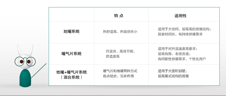目前市場(chǎng)上供暖有散熱片系統(tǒng)和地暖系統(tǒng),散熱片系統(tǒng)使用方便,每組散熱片均設(shè)有控制閥門(mén),控制方便,升溫快,并可以使用實(shí)木地板。地暖舒適性相比散熱片要好一些,而且不占?jí)γ婵臻g,但是地暖的最佳使用方式是進(jìn)入冬天后連續(xù)使用效果才會(huì)更好,地暖本身的特性是溫度舒適,升溫速度慢(初次使用往往需要低溫運(yùn)行1-2天)。